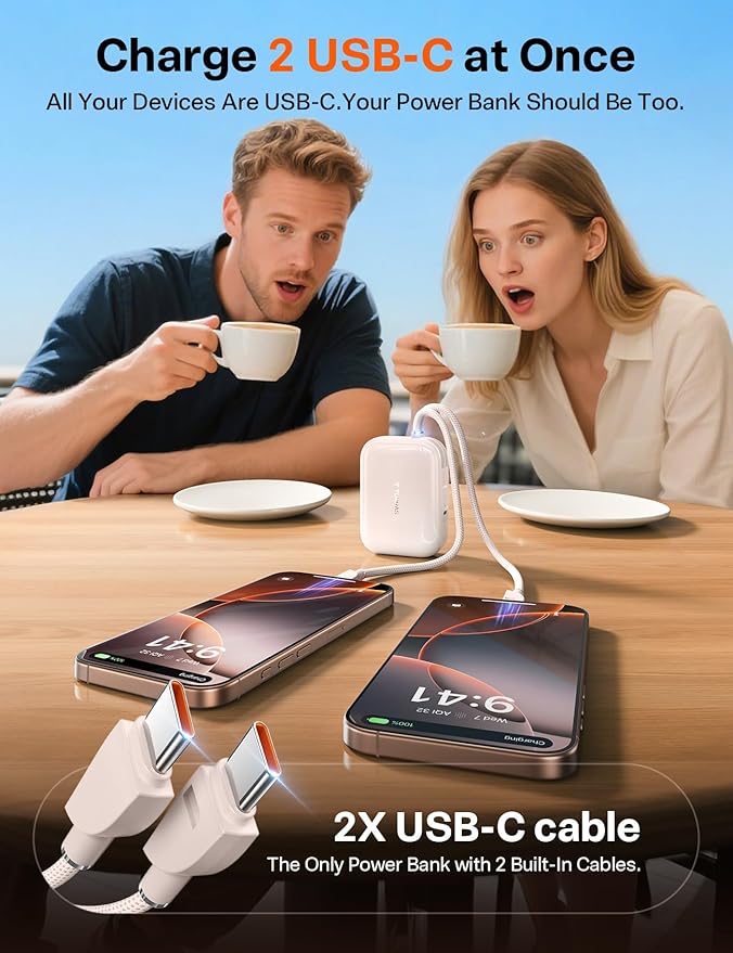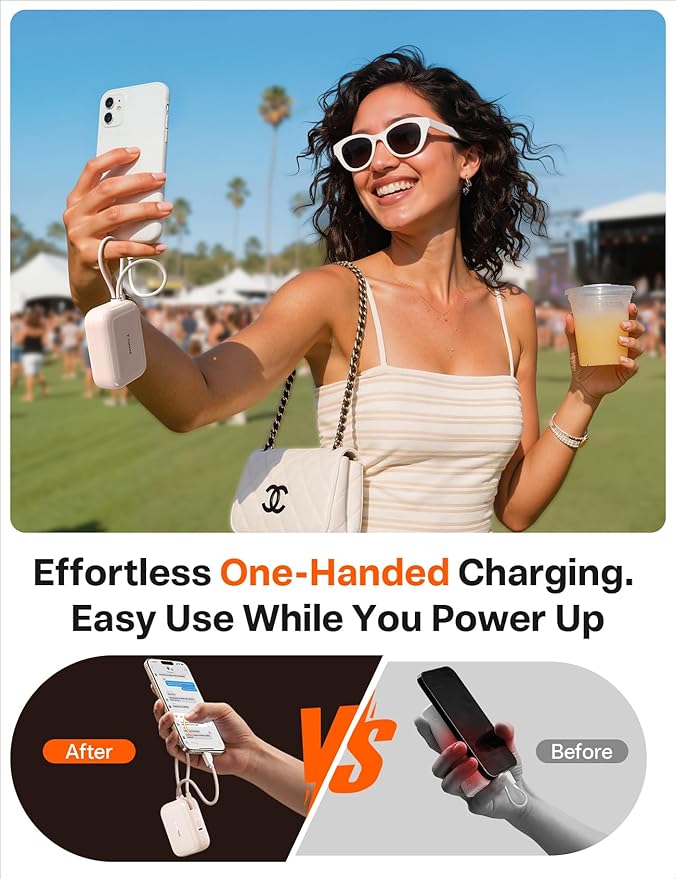 - ๐๐ง๐-๐๐๐ง๐ ๐๐ก๐๐ซ๐ ๐ข๐ง๐ , ๐๐ง๐ฒ๐ฐ๐ก๐๐ซ๐. Snap a selfie, scroll socials, or call on the goโno tangled wires, no awkward grips. With dual built-in USB-C cables and innovative loop design, you can charge hands-free, single-handed, or on the move. Itโs power made personal