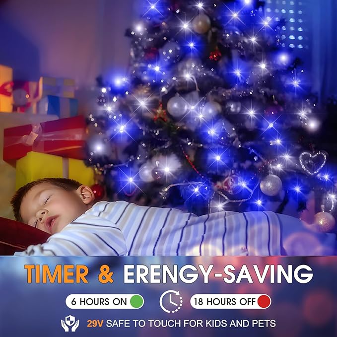 - Smart Timer & Memory — Let Your Lights Remember Your Life: With an integrated timer and memory chip, forget about turning the LED Christmas Lights ON or OFF manually. Decorative Lights automatically glow at 5 PM, welcoming you home after a long day, and turn off at 11 PM to save energy. For special occasions or extended celebrations, pre-set "Party Mode" (7 PM–3 AM) or "Holiday Mode" ensures your festive spirit never fades.
