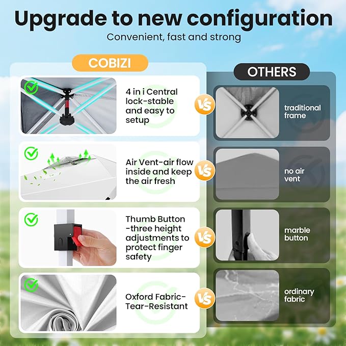 - One Push: COBIZI 10x20 party tent is conveniently designed with pre-installed frame and one push lock design. No tools are needed, just push the center lock upwards to quickly fix the frame, and finally install the sidewalls to easily complete the installation