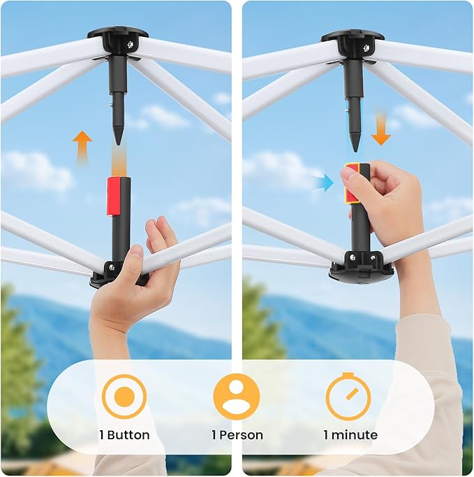 - Air Vent & Button Adjustment: The 10x20 camping tent includes 2 built-in ventilation ports that promote air circulation, maintain a dry interior, and enhance structural stability. Three levels of height adjustment, controlled by anti-pinch buttons, ensure safety during use