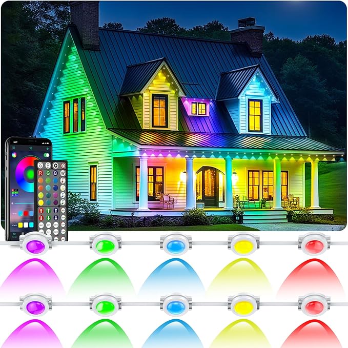 - Smart App Control for Custom Lighting:Transform your outdoor space with our app-controlled eave lights. Choose from 58 preset color scenes to create the perfect ambiance, or customize your own unique lighting style. The intuitive app lets you:adjust the color and brightness of the light zone, set automatic schedules for effortless operation, personalize your lighting with one-touch presets, enjoy complete control from your smart. Whether you prefer vibrant pulsating light or subtle ambience, our strips offer a wide range of options to enhance the functionality of your space while making a style statement.