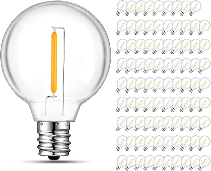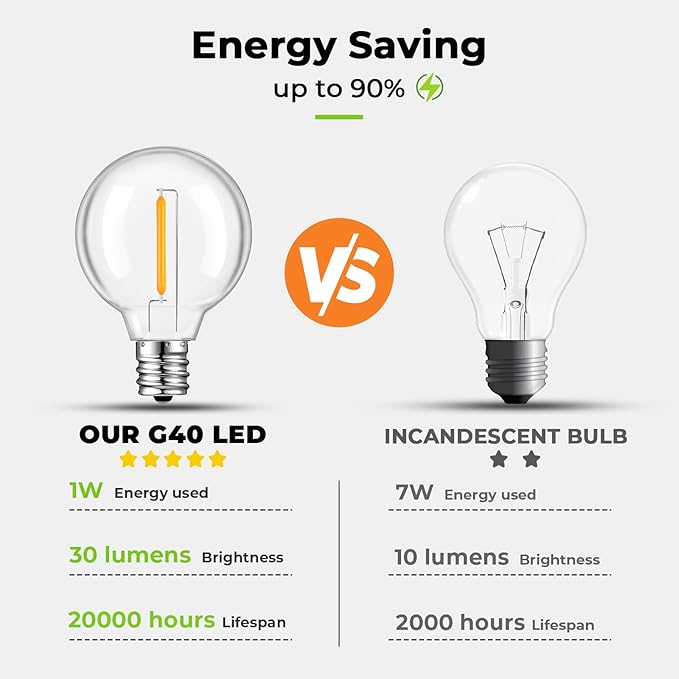 - 【G40 LED Bulbs – E12 Base】G40 string light bulbs bring nostalgic charm with modern efficiency. Each bulb fits standard E12/C7 sockets and adds a vintage flair to your lighting design.