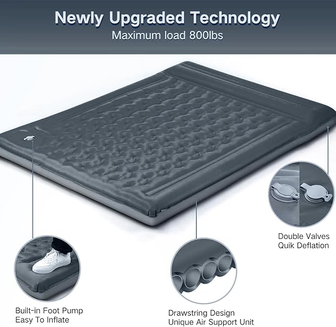 - DURABLE & PORTABLE: Ultra-thick waterproof 50D nylon and TPU eco-friendly materials, durable and tear-resistant, make this compact sleeping pad perfect for harsh environments in the field. The thickened film ensures that our self inflating camping pad is effectively puncture and moisture resistant without air leakage. Such a camping air mattress weighs only 5lbs, packs 2 people's sleeping gear in just one, You can say goodbye to sore backs and other discomforts normally left by bumps and rocks underneath the floor of your tent! ideal for family camping, hiking, backpacking, car trips, or for guests at home.