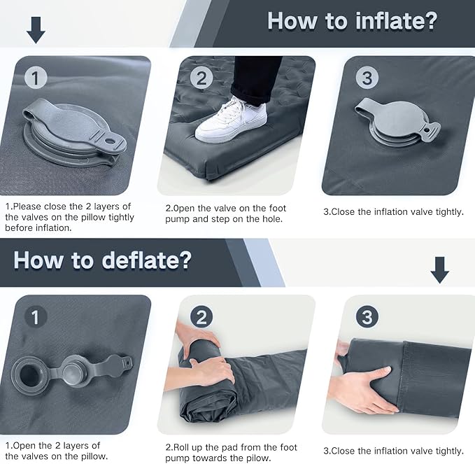 - BUILT-IN FOOT PUMP: No mouth blowing, no extra pump, FNARMW wide sleeping pad features a built-in foot pump. It takes only 3mins to fully inflate this thick queen sleeping pad by foot pressing, no mouth, no hands, clean and hygienic, even kids can finish inflating. Two double layer valves on the pillow can effectively prevent air leakage and achieve rapid deflation, just remember to close the valves tightly before inflation. NOTE: the inflation time depends on the speed of your foot pressing.