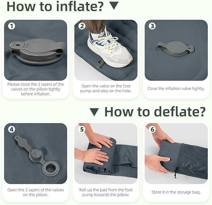 - 【Only 30s Step to Inflate & 1s Deflate】 Including an innovative built-in foot pump- Just pedal 30-60s to fully inflate the camping mat, which is convenient and easy, no longer need to inflate with your mouth, hands or carry a pump, and it only takes 1 second to quickly deflate. With the upgraded version of the air release valve with no leaking film, you shall never worry about air leaking!