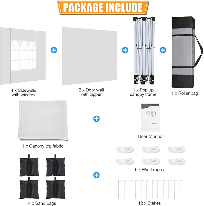 - Products Included: 1 pop up tent 10x20, 1 Oxford cloth carrying bag, 12 ground pegs, 6 wind ropes, 4 sandbags, and 8 windbreak poles.