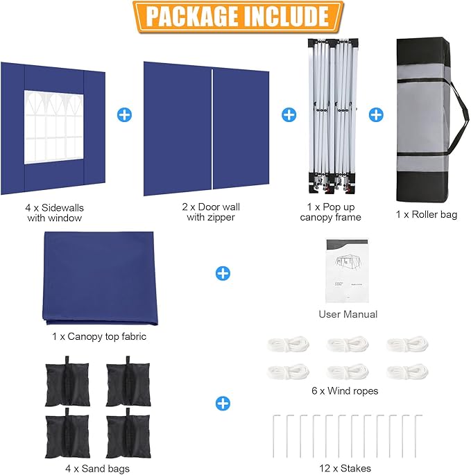 - Products Included: 1 pop up tent 10x20, 1 Oxford cloth carrying bag, 12 ground pegs, 6 wind ropes, 4 sandbags, and 8 windbreak poles.