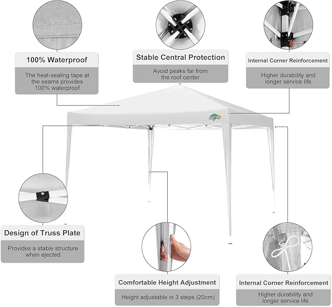 - 【Easy Set up &Take Down】No tools required.The COBIZ1 10x10 easy pop up canopy is designed for convenience. All the parts are already assembled, so you don't have to worry about missing pieces or searching for tools. Whether you're setting up for a party or taking it down after an event, our tent makes the process quick and effortless.