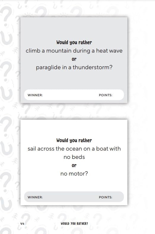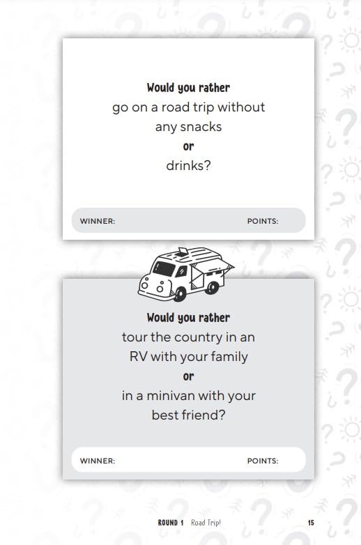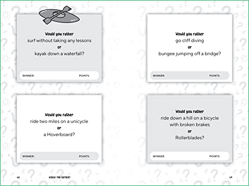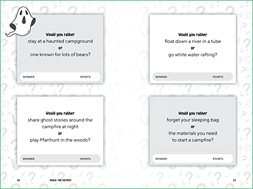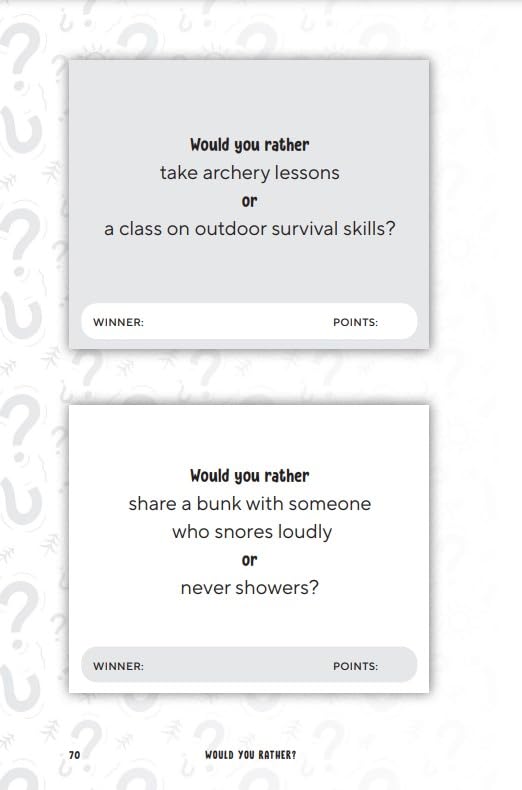 Thought-provoking scenarios that entertain and challenge kids ages 8-12 to think creatively and speak persuasively. 160+ "Would You Rather?" questions about campfires, whitewater rafting, pool parties, rock-climbing, bottle rockets, capture the flag, and so much more. Awesome entertainment for camping, summer camp, and road trips. Tech-free fun for lazy summer days. A competitive game for kids and families; who’s the smartest of them all?